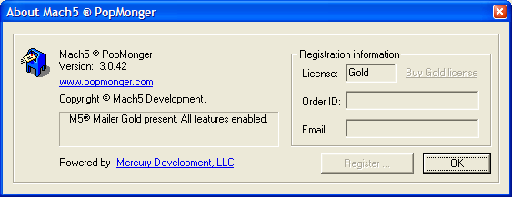 To register PopMonger, just choose the Registration option under the Help menu, enter the order ID, the email used when ordering, and your registration key into the dialog box. Your PopMonger registration key looks something like PM3Gold-1-123ab-78cd1-abc12.
