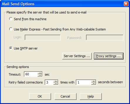 In order to be able to send email, PopMonger requires that you configure the program to use a mail server. You can use your own mail server that you normally use to send email. PopMonger supports ESMTP and POP3 authentication to an SMTP server. If you use an Exchange server, you will need to set up your Exchange server to enable SMTP relaying from your local network.