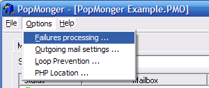 The Options menu contains all the program wide settings for PopMonger. These are Failures Processing, Outgoing Mail Settings, Loop Prevention, and PHP Location.