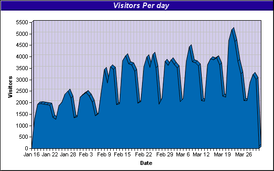This graph, generated by FastStats Log Analyzer, is dominated by a weekly, cyclical pattern; this web site sells business-related products, and receives dramatically more hits during the weekday than during the weekend.